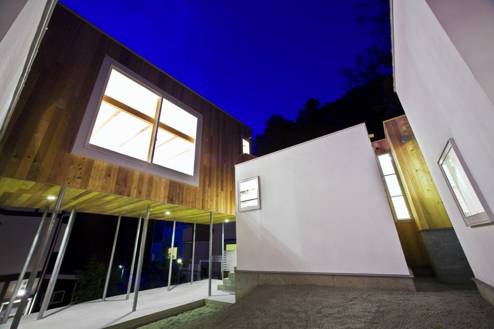 Los arquitectos se aliaron con el terreno evitando alterar en exceso la topografía del solar. Por ello la vivienda se organiza en varios niveles de altura. A través de unas sencillas escaleras de madera se conectan interiormente los volúmenes, reduciendo así los gastos de construcción derivados del movimiento de tierra. Así, se crea además un edificio con ritmo arquitectónico, compuesto por fachadas simples pero con un gran sentido de la verticalidad.